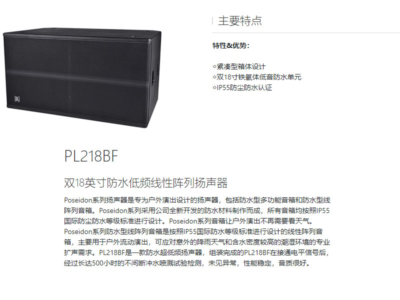 Poseidon係列揚聲器是專為戶外演出設計的揚聲器,包括防水型多功能音箱和防水型線陣列音箱。Poseidon係列采用公司全新開發的防水材料製作而成,所有音箱均按照IP56國際防塵防水等級標準進行設計。Poseidon係列音箱讓戶外演出不再需要看天氣。Poseidon係列防水型多功能音箱是按照IP56國際防水等級標準進行設計的多功能音箱,主要用於戶外流動演出,可應對意外的降雨天氣和含水密度較高的潮濕環境的專業擴聲需求。體積小巧、結構緊湊、重量輕,接插安裝十分便捷,特別適宜戶外流動演出使用.